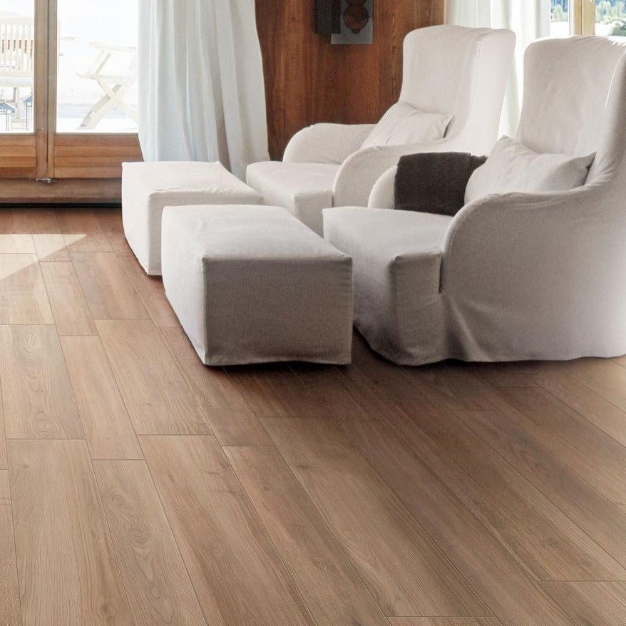 Tactile sensations, veins designed by time and natural colour shades: Bungalow covers contemporary living spaces with the essence of the most precious woods. Totally environment friendly and evokes all the appeal of wood combined with the reliability of modern porcelain stoneware.
