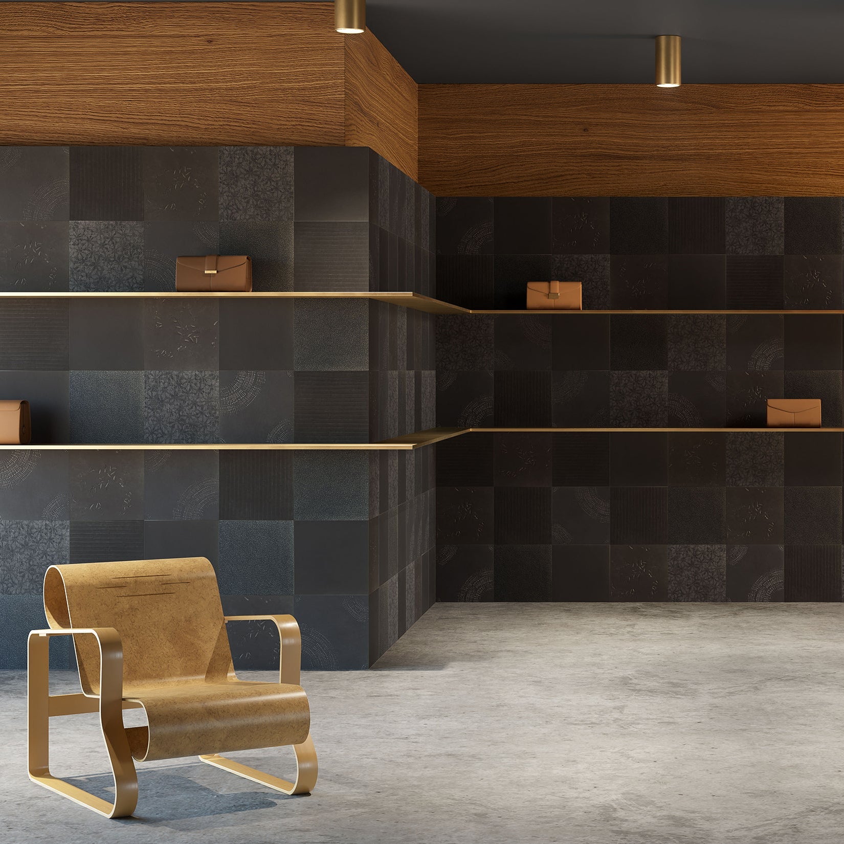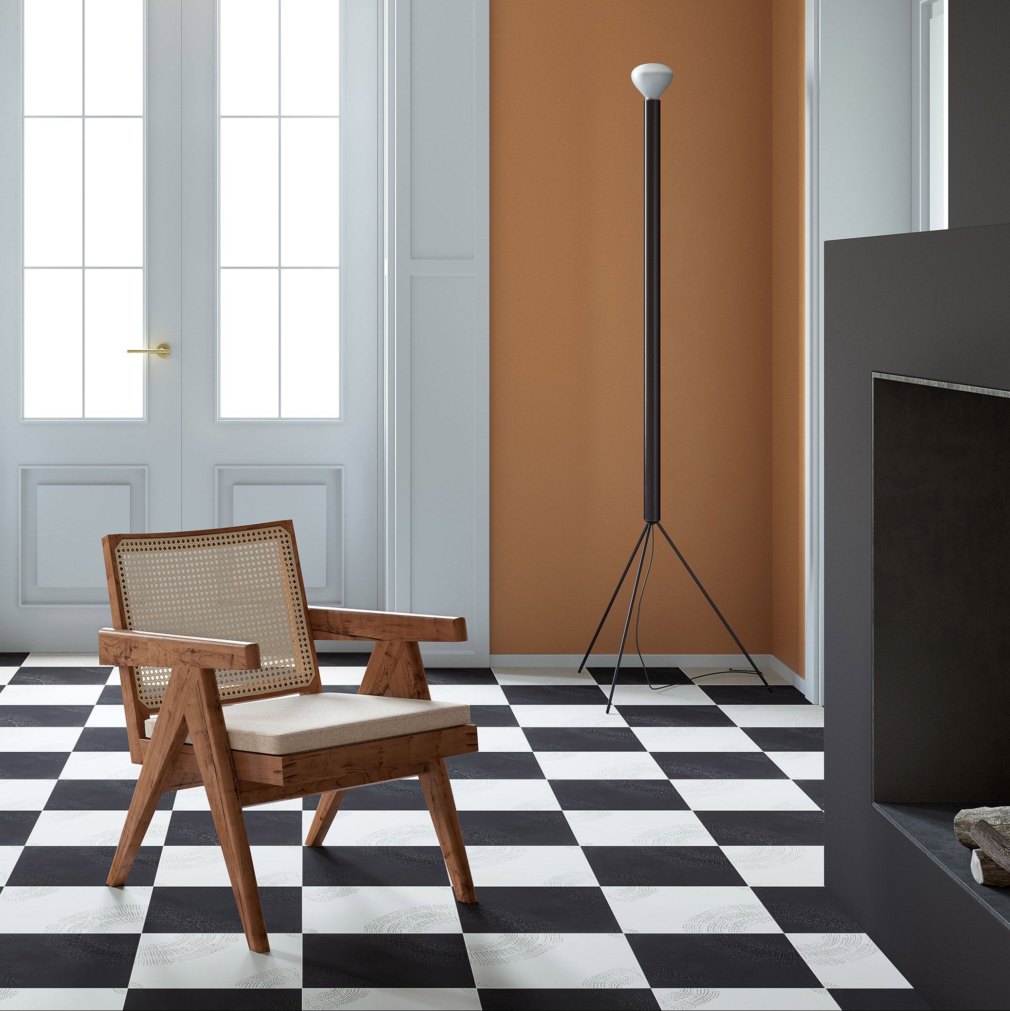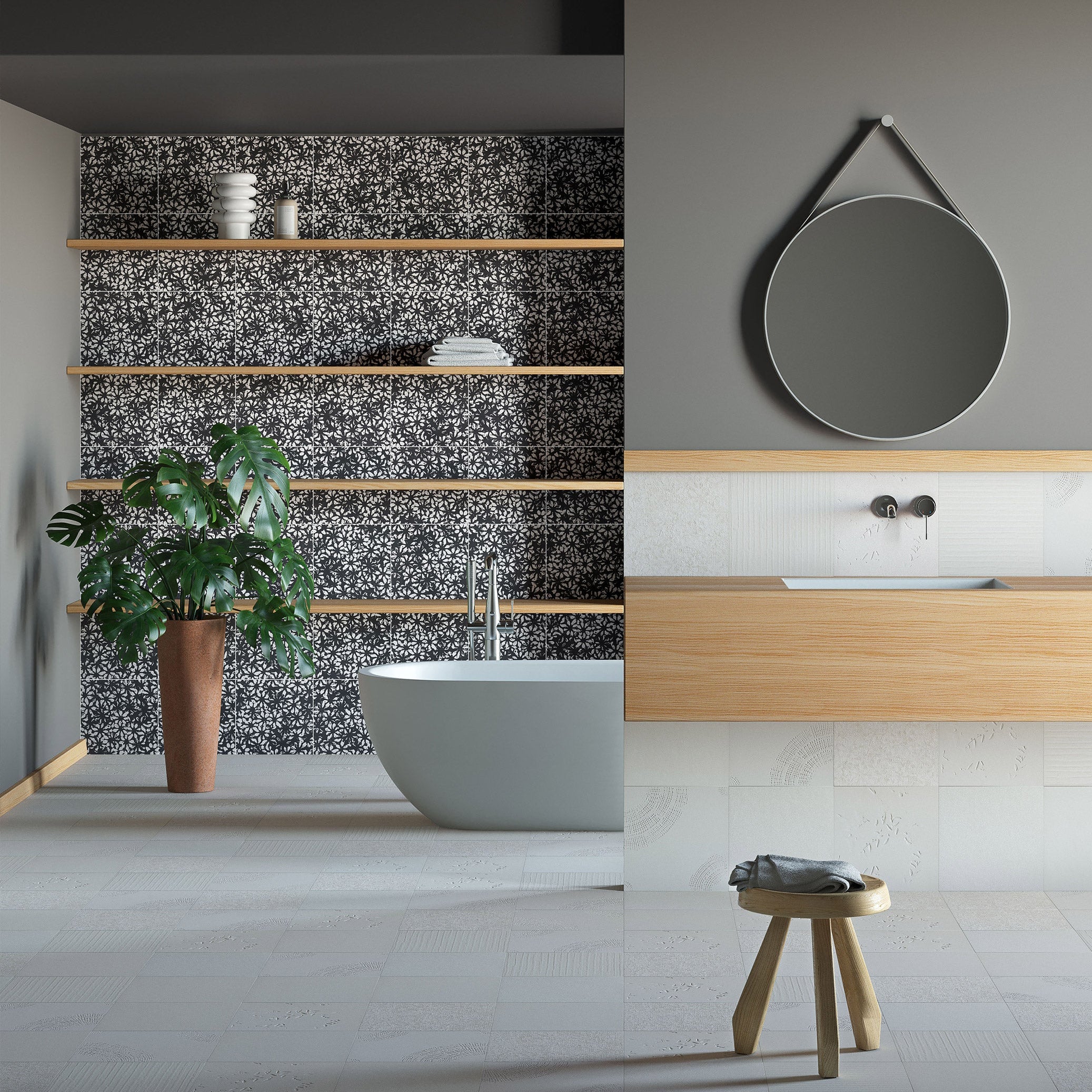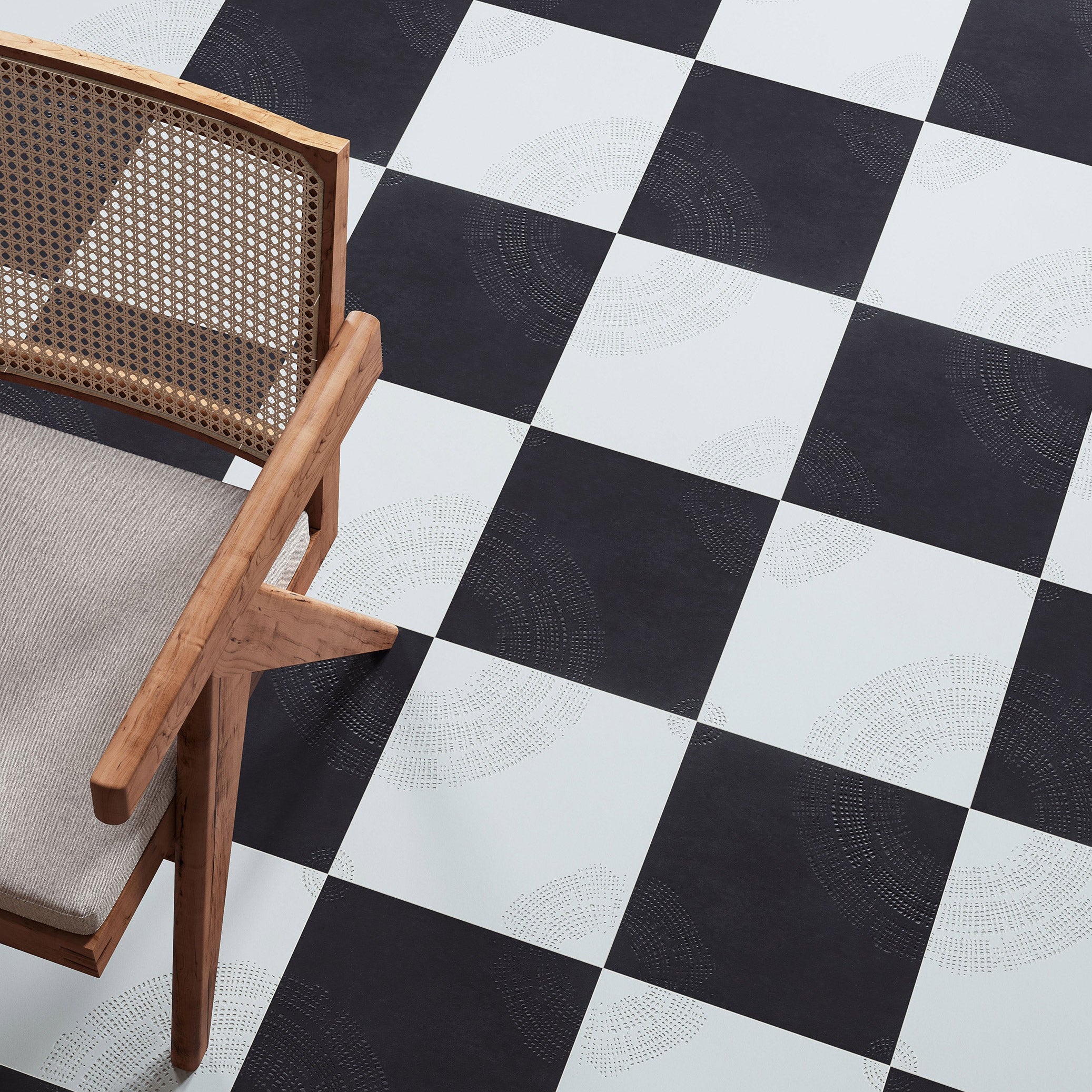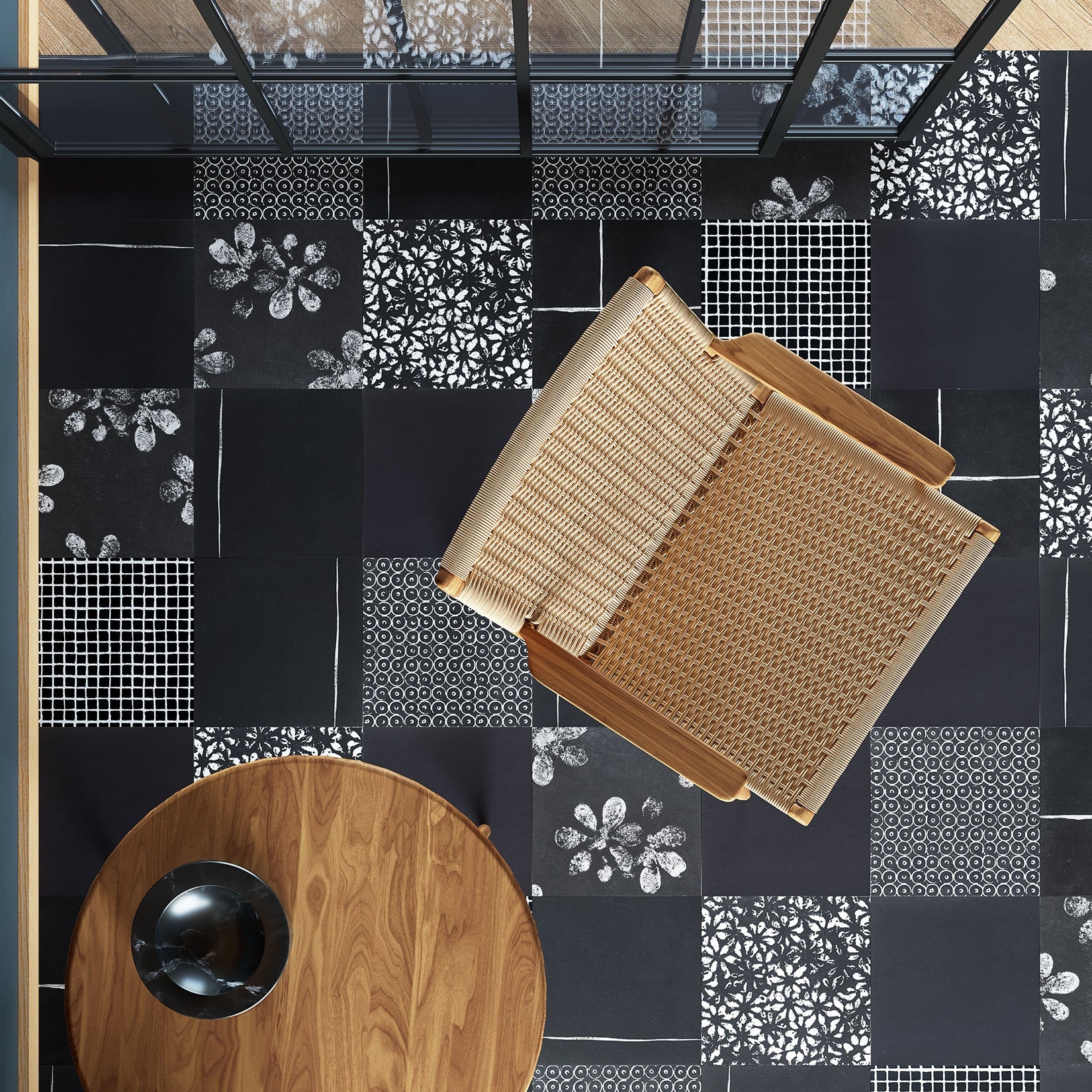 Chimney Ash is a graphic surface collection that reinterprets black and white through bold contrasts and expressive mark-making. Its textured patterns shift between light and shadow, creating a dynamic visual rhythm that brings depth, character, and contemporary graphic presence to interior spaces.