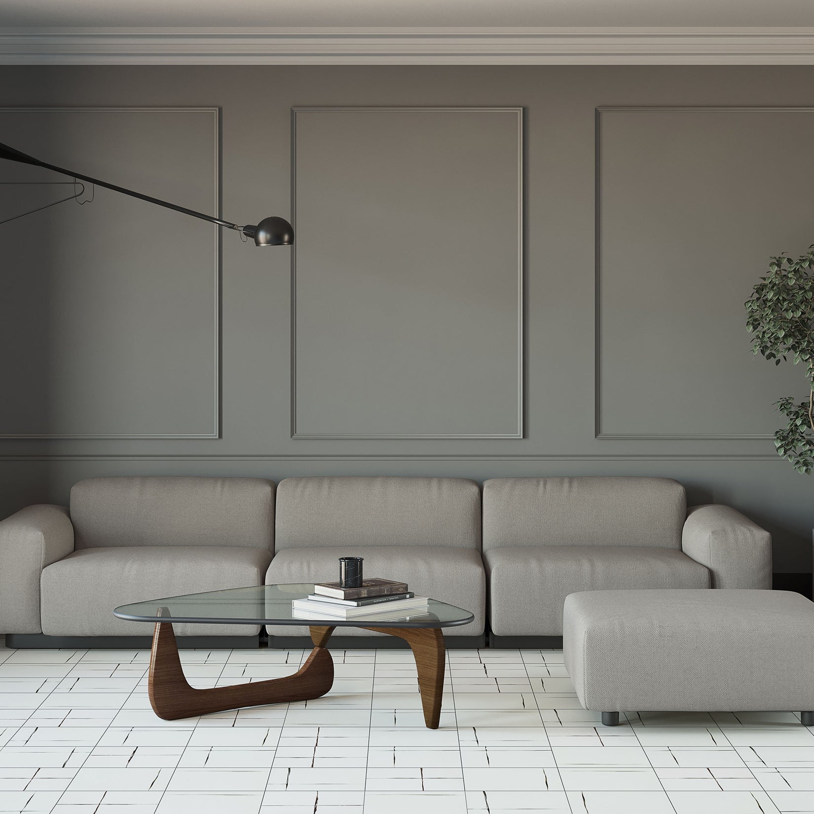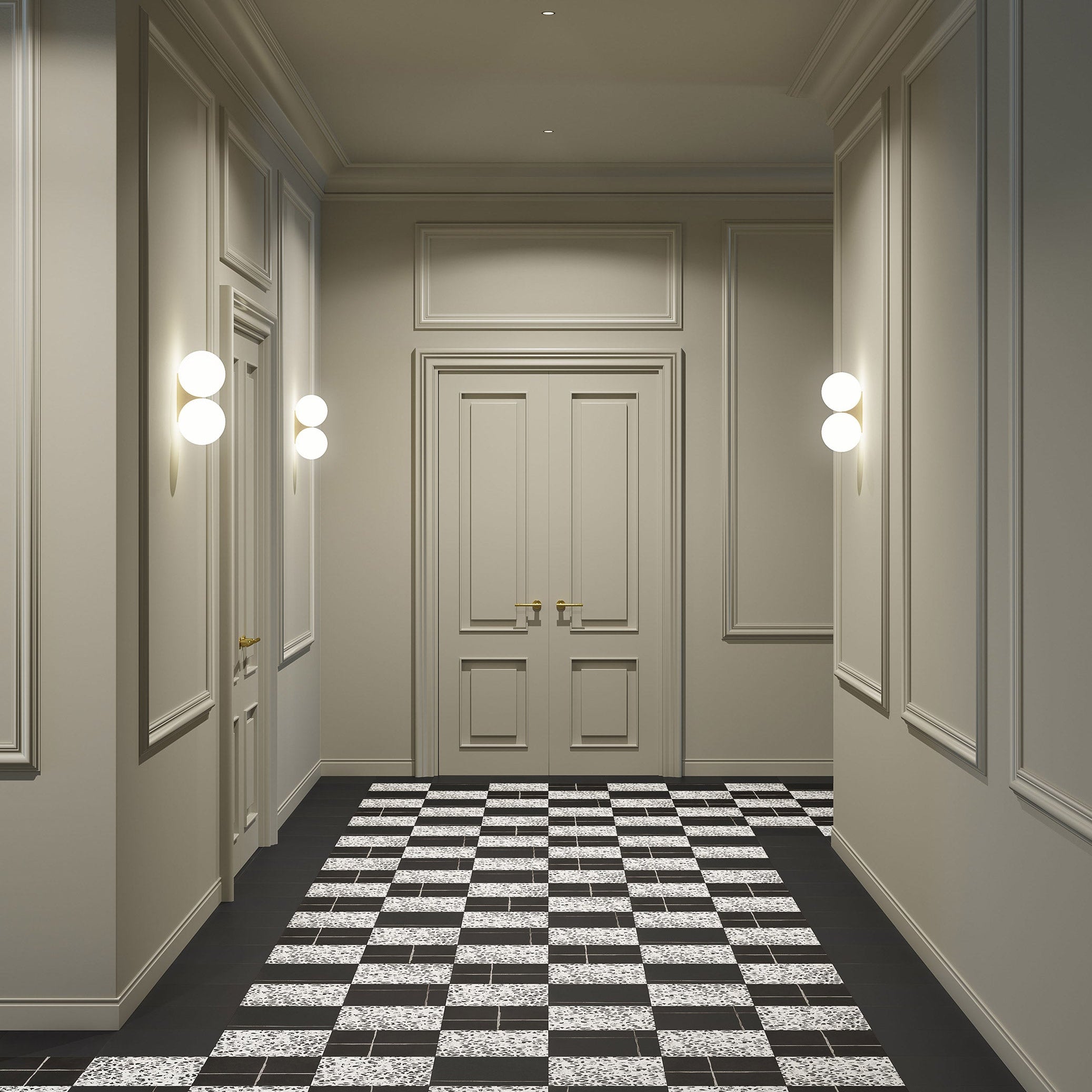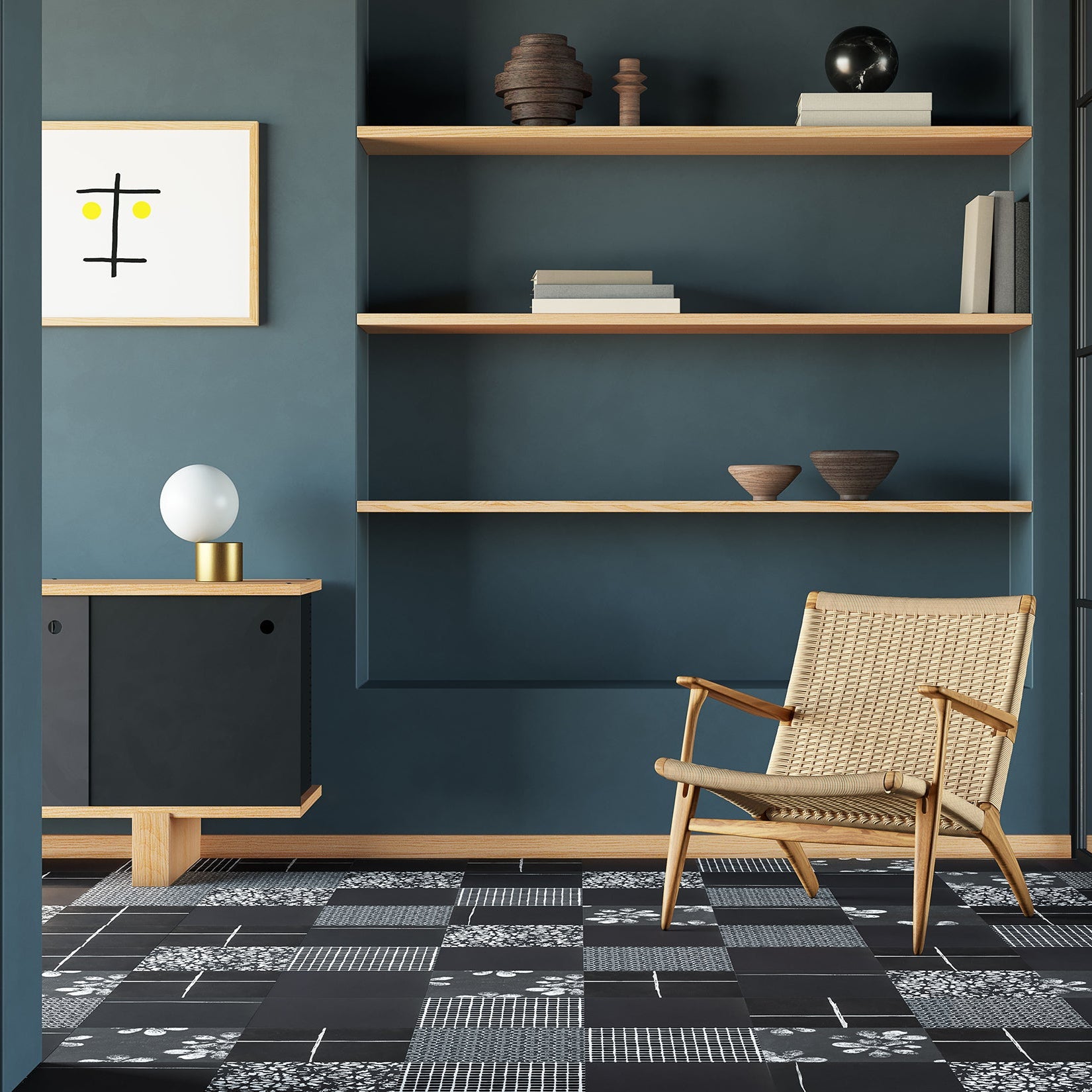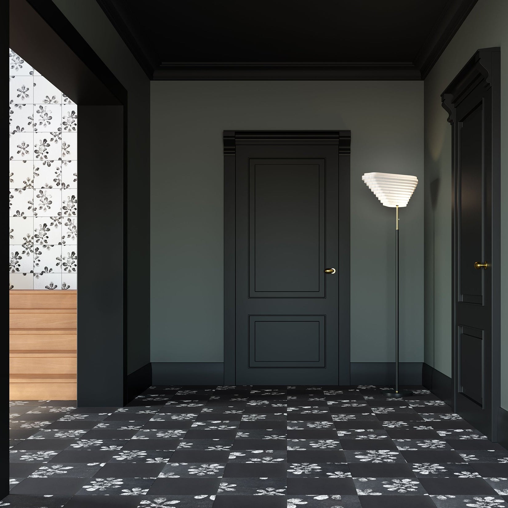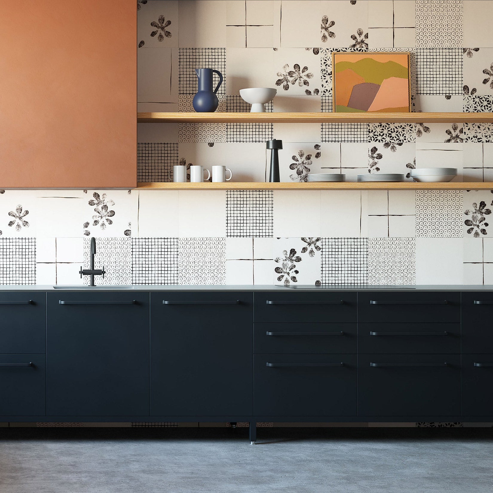 Chimney Ash is a graphic surface collection that reinterprets black and white through bold contrasts and expressive mark-making. Its textured patterns shift between light and shadow, creating a dynamic visual rhythm that brings depth, character, and contemporary graphic presence to interior spaces.