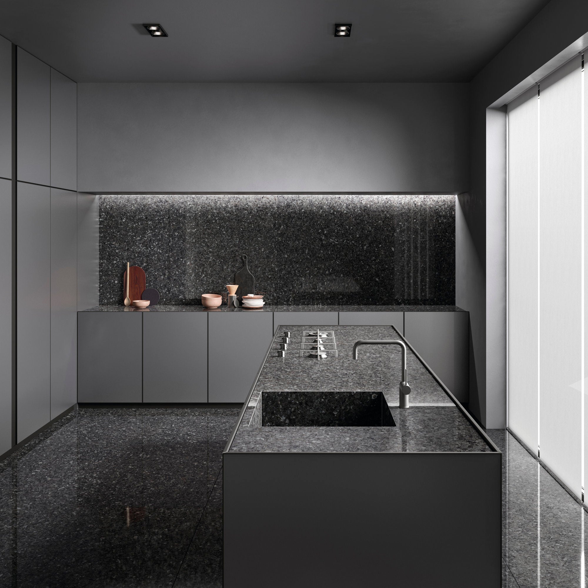 Inspired by nature, the Granstito collection features large porcelain panels with a stunning granite effect. These surfaces mimic the look of natural stones, ranging from light beige to grey and dark black. The collection offers a unique, innovative, and environmentally friendly architectural solution, interpreting varied forms of expression.