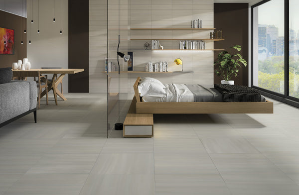 Porcelain stoneware becomes a tool for design to give value to contemporary spaces. Delicate tone-on-tone directional lines offer character and originality to the material.