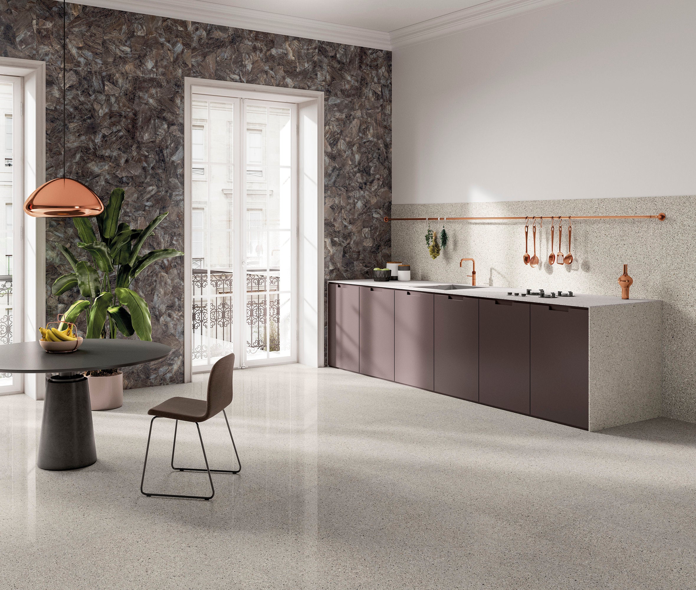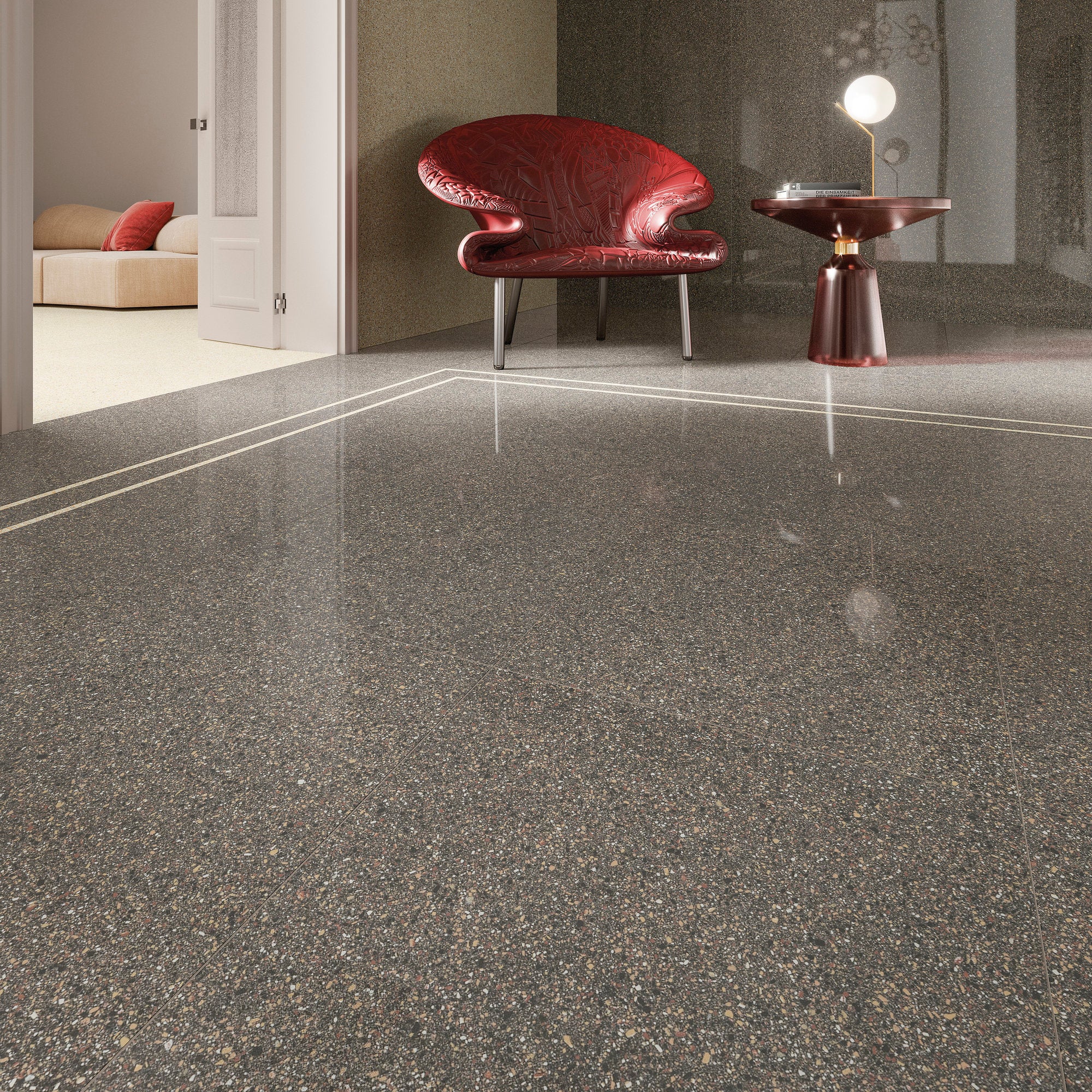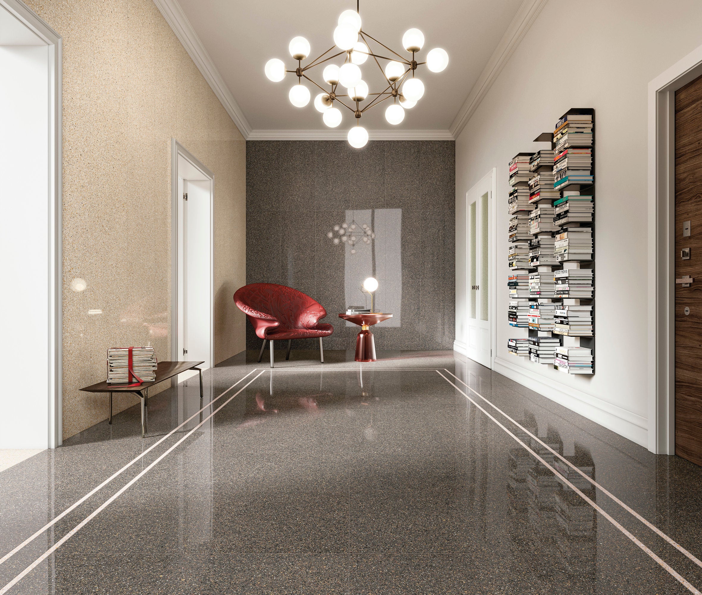 A material that is homogeneous throughout. A solid material which makes no distinction between outer surface and core, made with interpenetrating mixes of different colors. Portal Lado is made exclusively from prestigious minerals and clays, extracted and worked using sustainable methods. Earth, water and fire: no solvents, resins or chemical additives. One-of-a-kind production facilities and know-how permit preparation and combination of the extraordinary variety of colored mixes and fragments that go into every Portal Lado tile. Multiple colored mixes are randomly blended to create a unique, unrepeatable mix in every slab. A system of patented technologies reproduces the randomness of nature and handmade objects. Powerful presses compact the slabs; ultra-high firing temperatures irreversibly weld and fuse the minerals to create a new material: hard, compact, impermeable, rock solid. Every single slab looks different from all the others. The distribution of the colors and grain, random and unrepeatable, composes a harmony with the unique fascination of nature and hand craftsmanship.