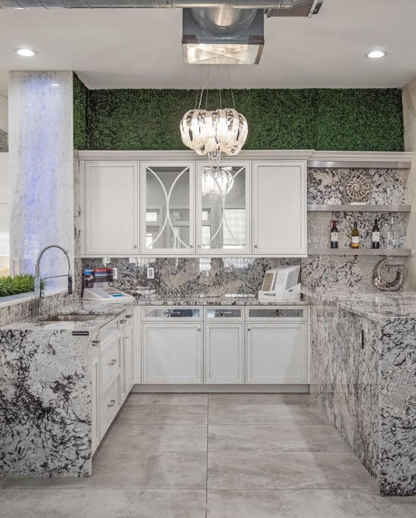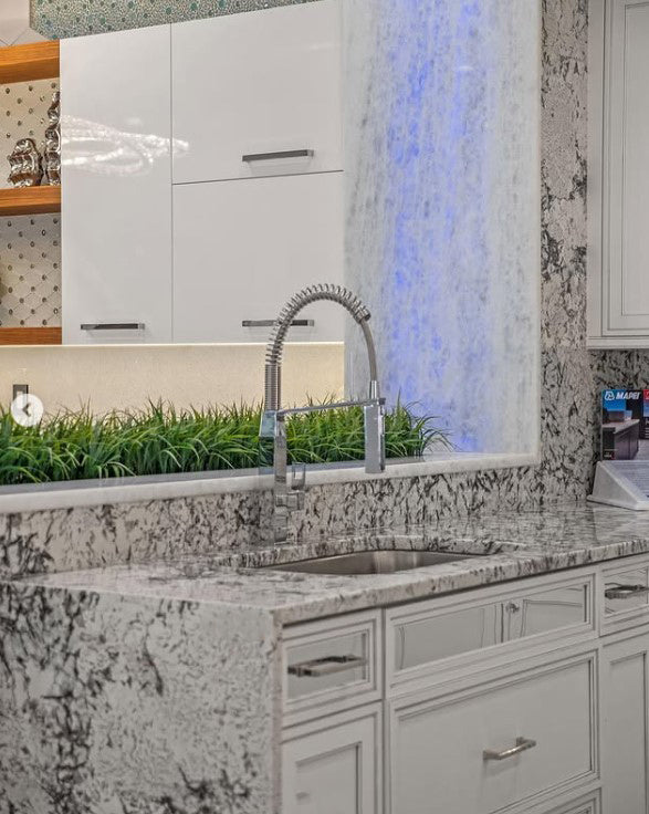 Prima Mistico is a breathtaking granite that combines subtle elegance with a textured, dynamic design. Its soft white base is accented with intricate patterns of light grays, soft creams, and speckles of charcoal, creating a serene and sophisticated appearance. The natural movement of its veining and speckles adds depth, making it a versatile and timeless option for countertops, feature walls, and flooring.