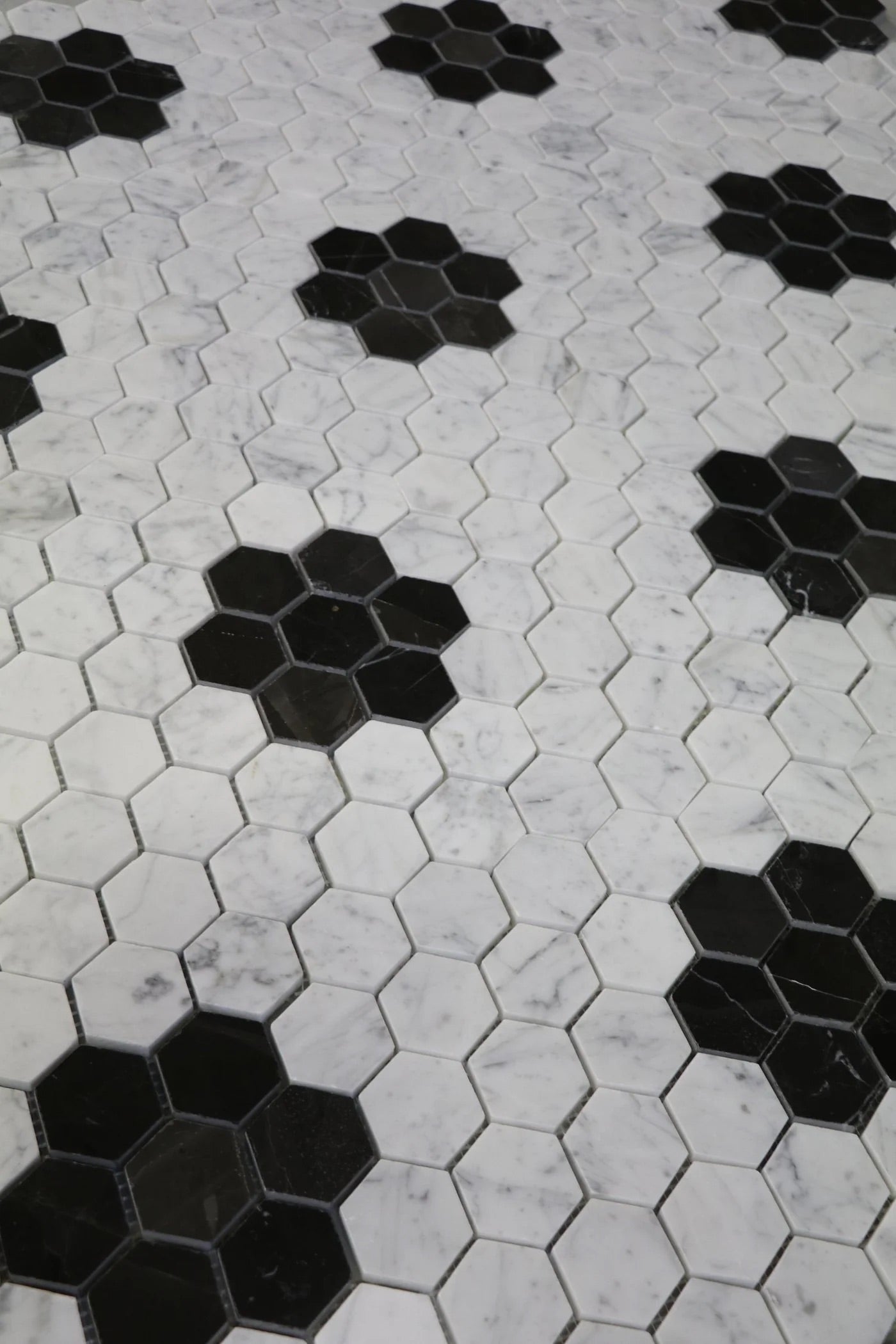 The Selden and Georgina Floral Hex features a captivating blend of Selden and Georgina marbles, arranged in a floral-inspired hexagonal pattern. The luminous white veining of Selden contrasts beautifully with the deep, rich tones of Georgina, creating a striking visual effect. This polished marble mosaic adds timeless elegance and intricate detail to any space, making it ideal for both contemporary and traditional interiors.