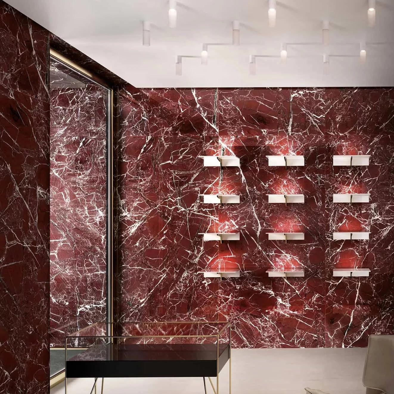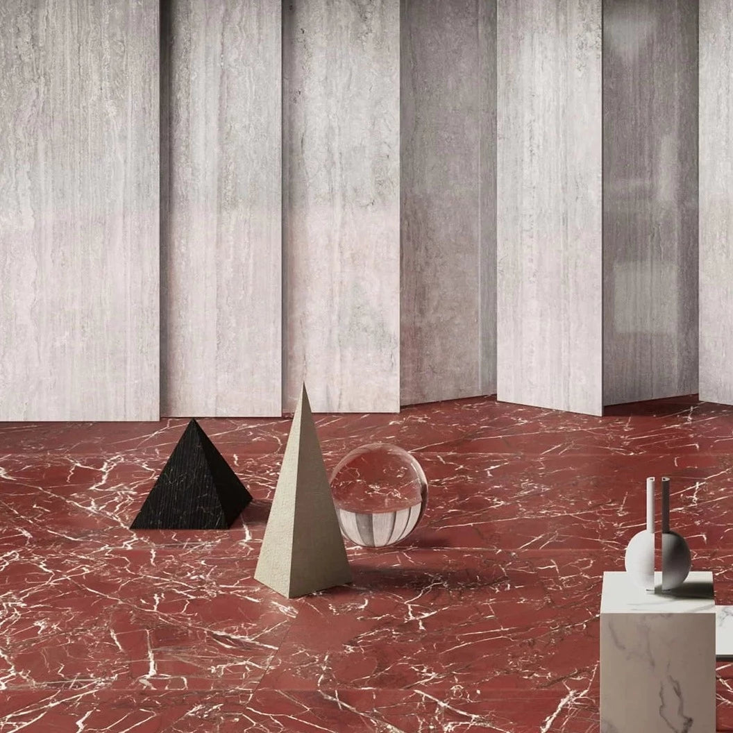Symphony has created captivating surfaces able to capture the chromatic perfection of this material: blood red towards purple furrowed with thin white veins of Rosso.