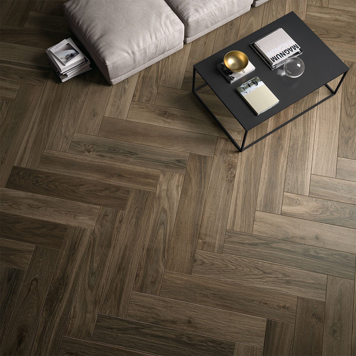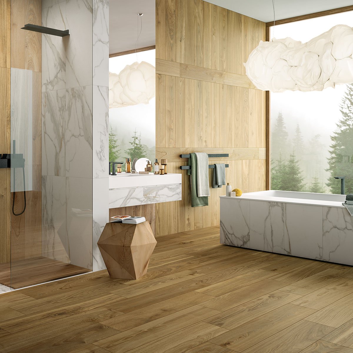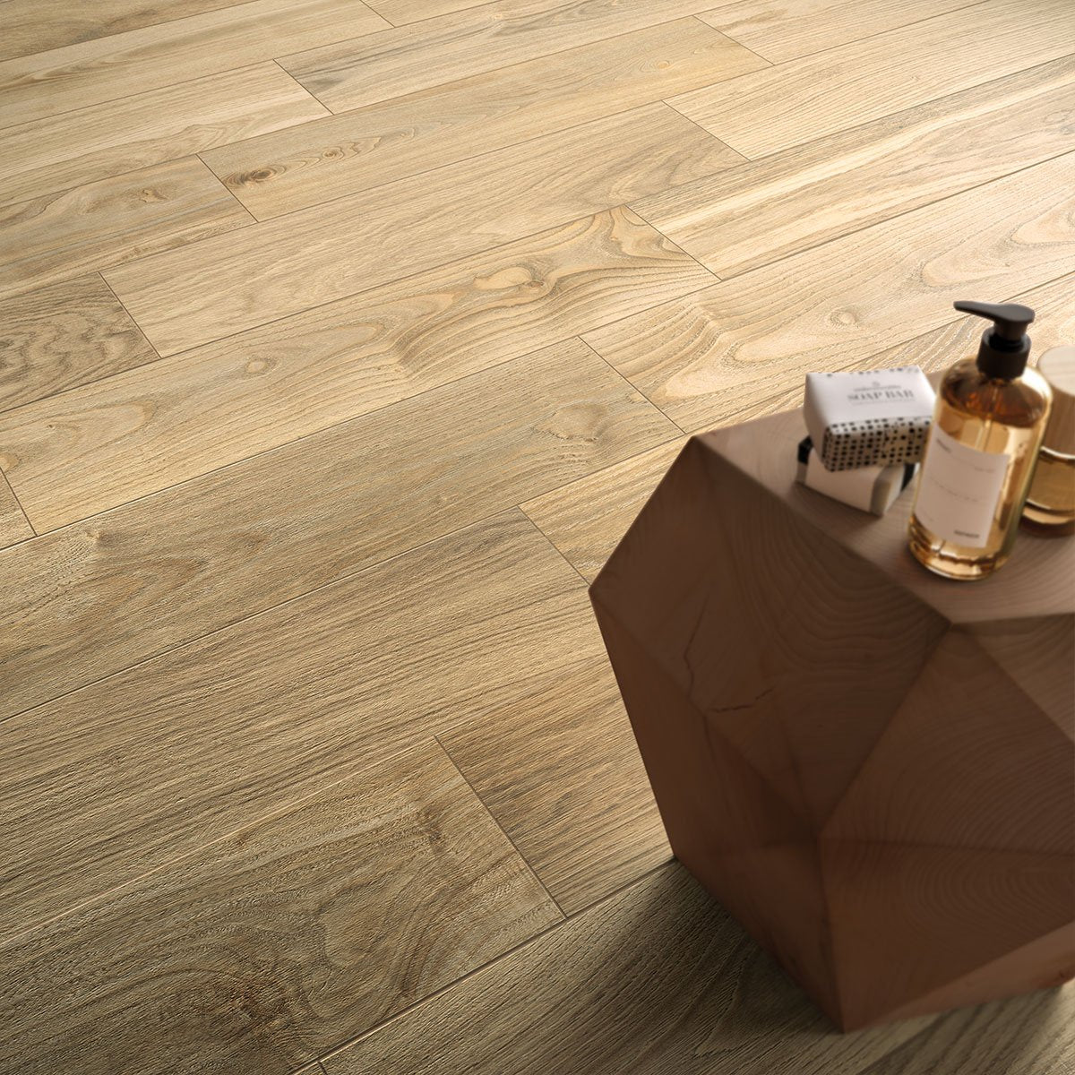 This collection of porcelain stoneware tiles offers the simple and elegant look of natural newly cut wood, with no wear or machining marks. It is a sincere material for clean, orderly surfaces, with a genuine graphic pattern giving a feeling of authenticity and sophistication.