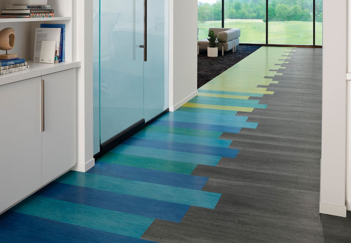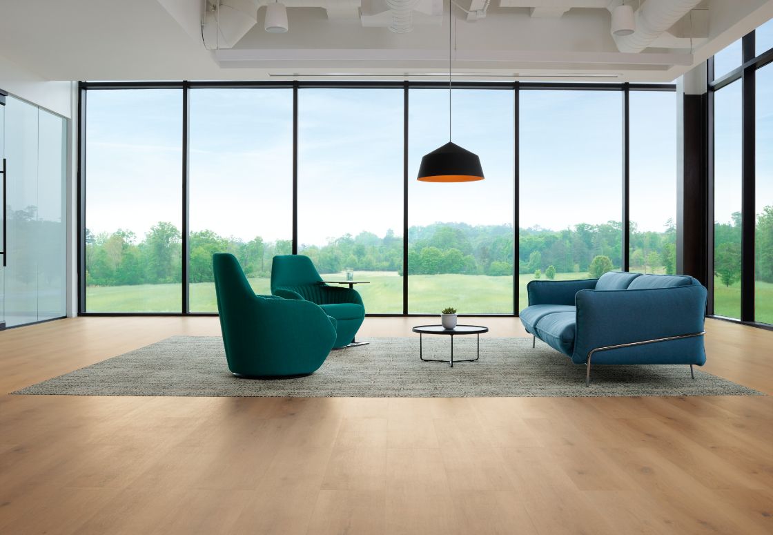 Wed Collection brings together the look of refined wood and stone in neutral and bright shades. Loose lay or adhered to the floor, it combines a natural beauty and the utmost durability. The 5 mm thickness allows installation with carpet tile without the need for a transition strip.